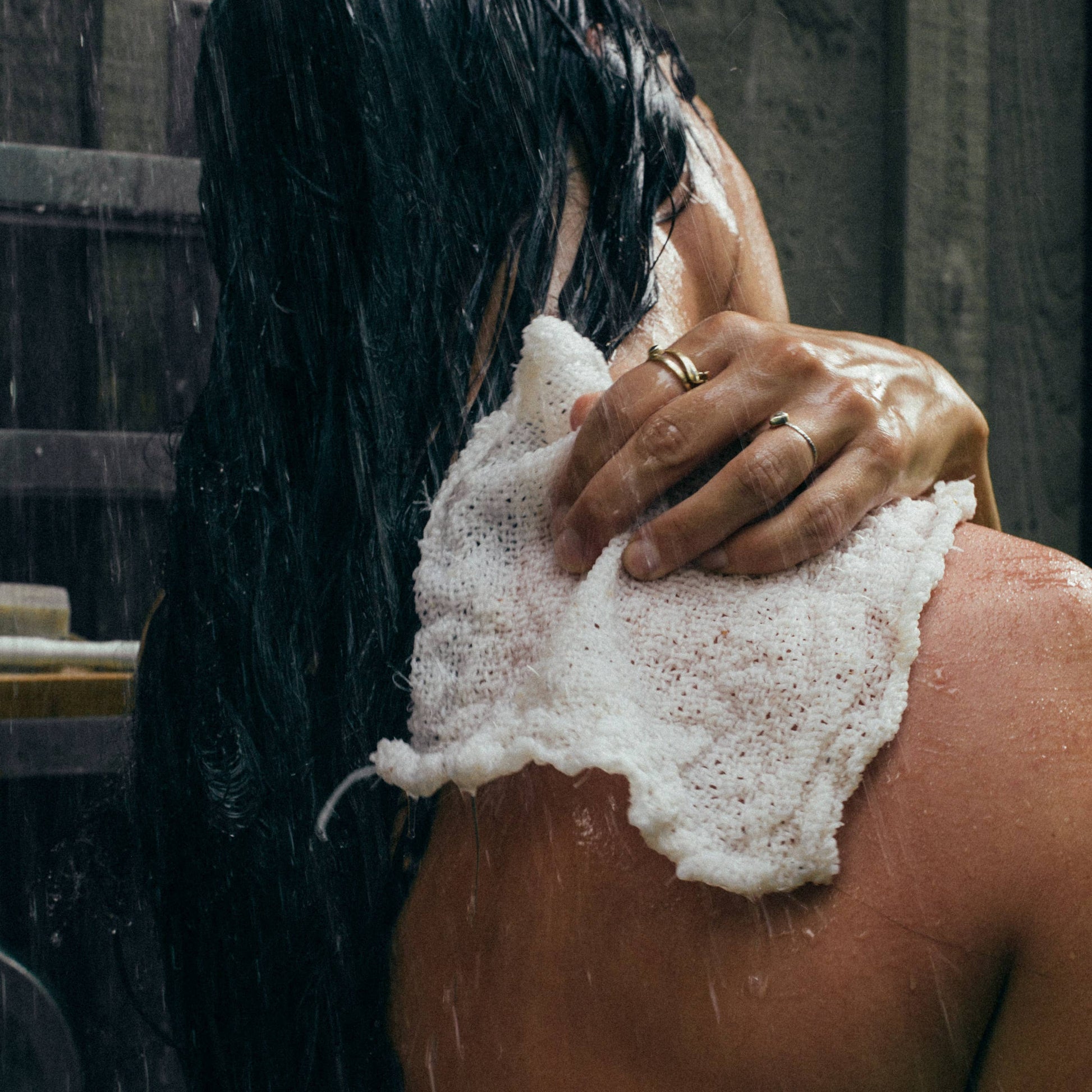 Soak your cloth in water until it feels soft and pliable—the first time will need the longest dip. Gently sweep it over your skin in a circular motion, either on its own or with soap, and when you’re done, let it dry out completely to prolong its life.