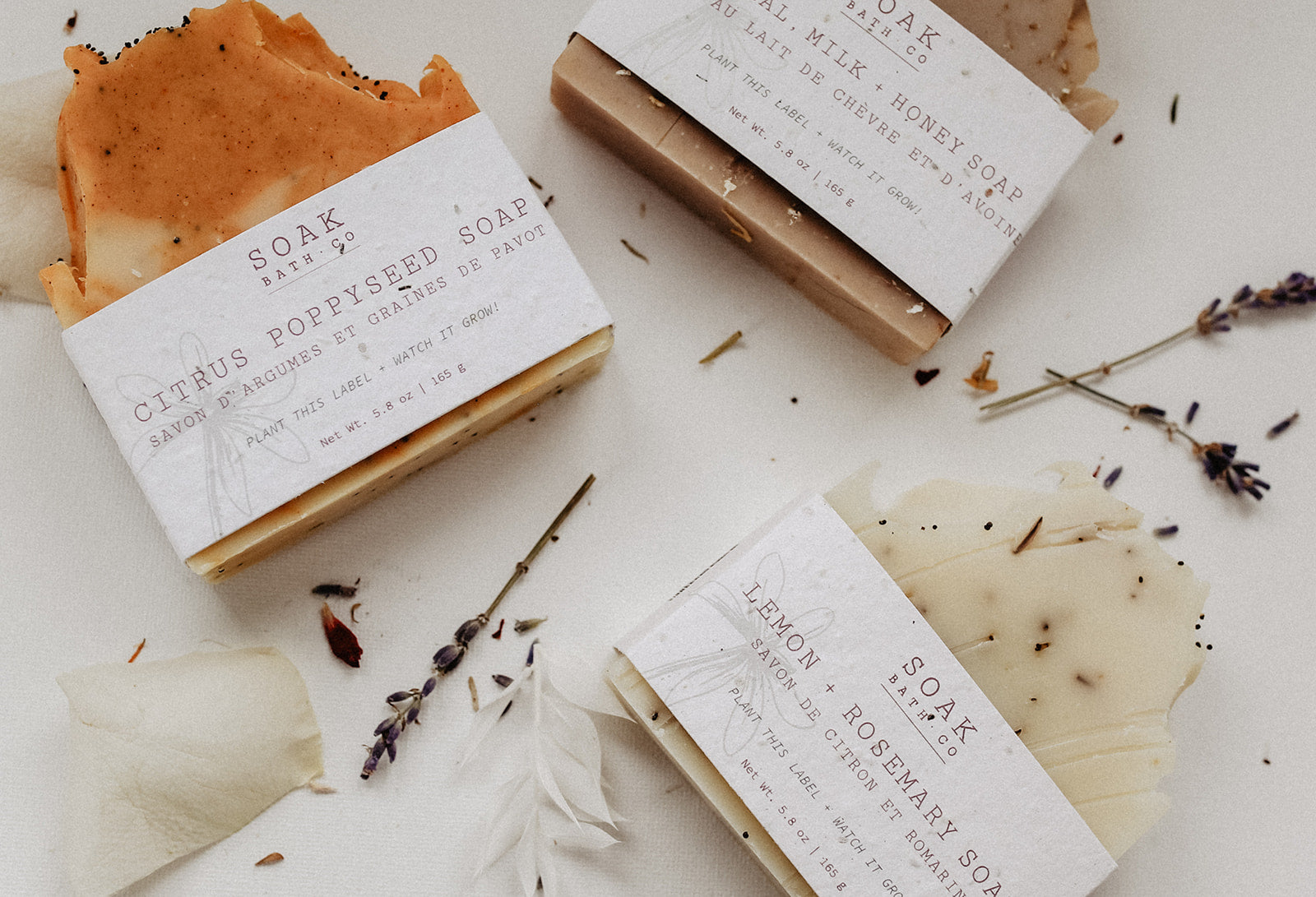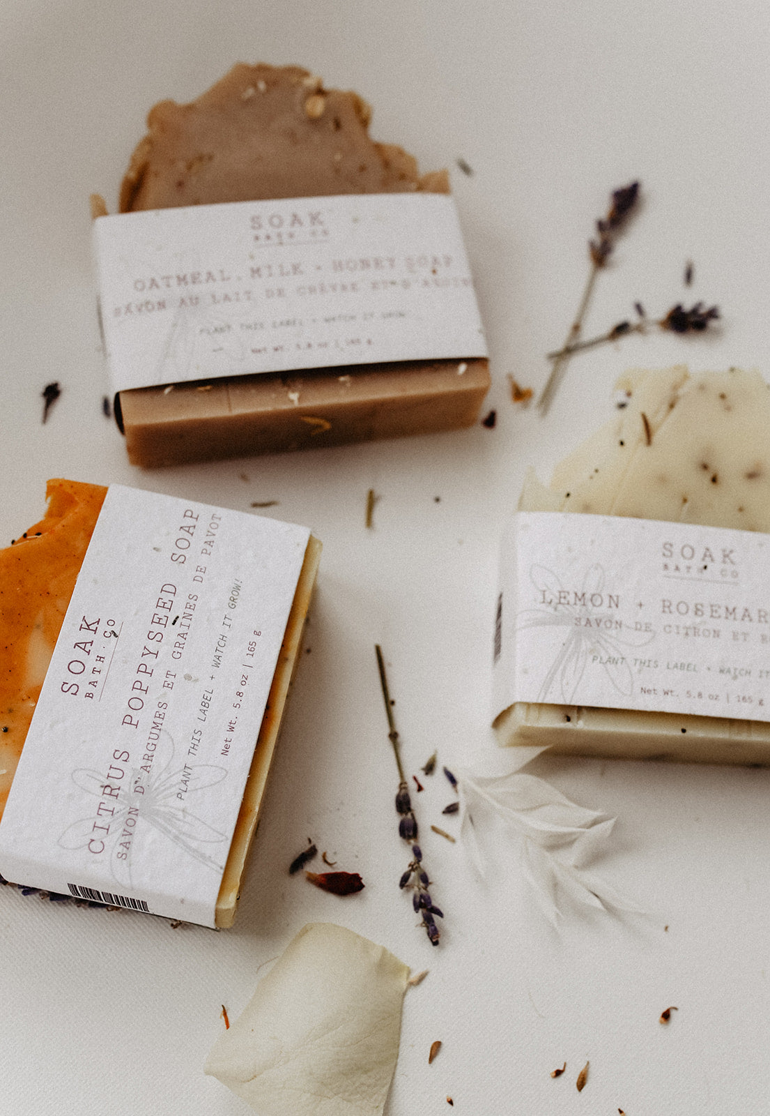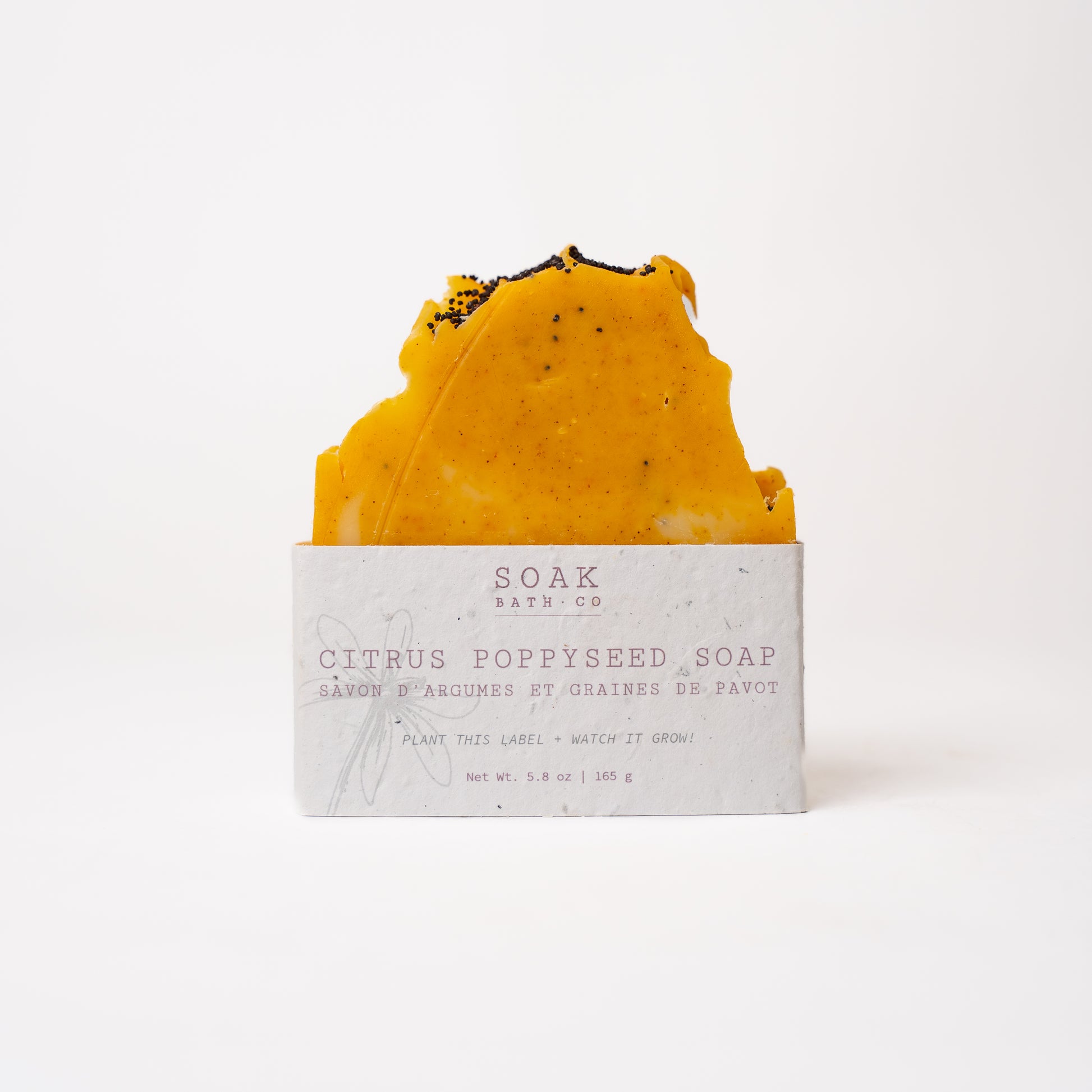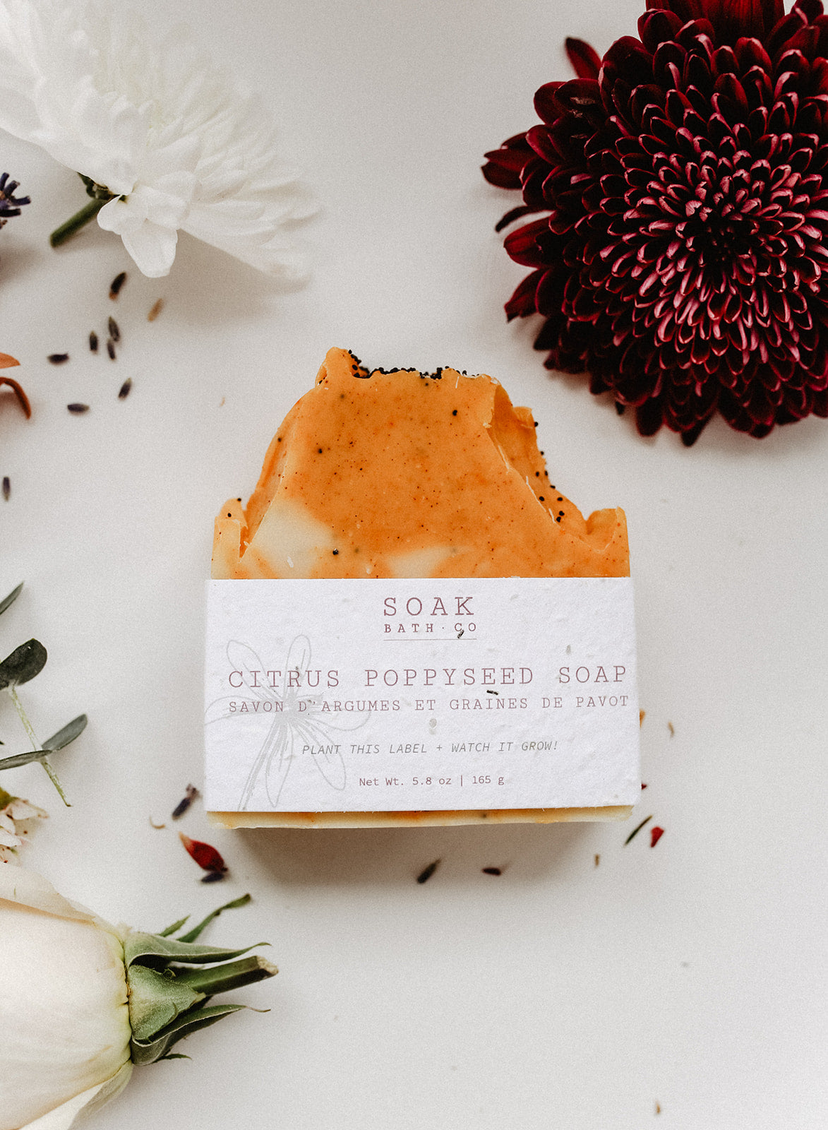 A delicious blend of Lemon and Orange essential oil come together in this stunning beauty of a soap bar. Poppy Seeds are added for exfoliation and doesn't it just make it look like a slice of poppy seed cake? Recommended as a body + hand soap bar. This gorgeous bar is completely zero waste and sustainable. The label on each SOAK Bath Co bar is made of biodegradable, plantable seed paper so you can plant the label and it will grow into wildflowers!