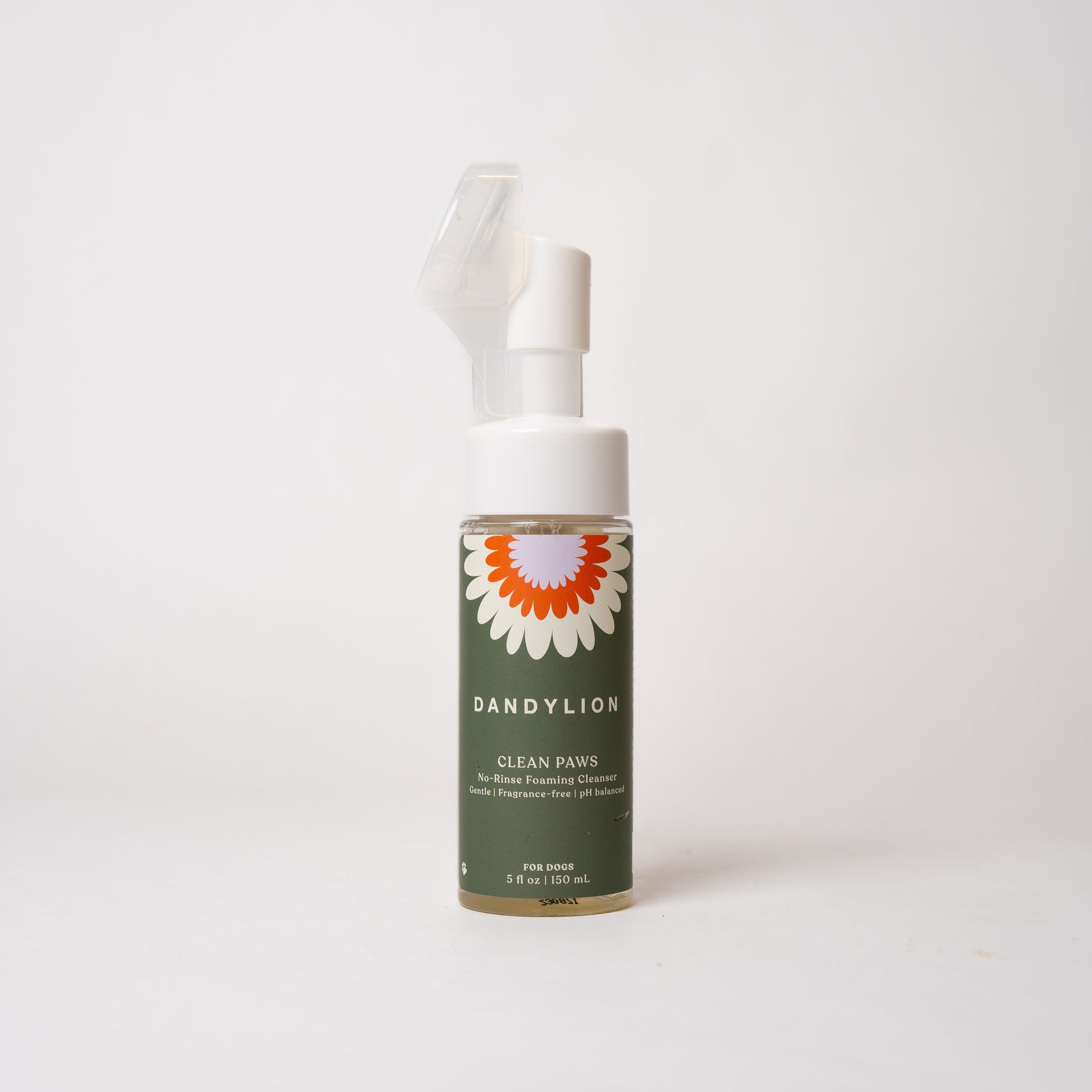 Instantly wash dirty dog paws with Dandylion’s Clean Paws No-Rinse Foaming Cleanser. The foamy formulation and soft silicone bristles allow you to get into hard-to-reach areas and perform a gentle deep clean without stripping your dog’s paws of its natural oils. Plant-based ingredients, such as aloe juice, pomegranate juice, broccoli seed oil and grape seed oil, providing soothing, nourishing, and anti-microbial benefits to irritated, itchy or dry paws. Free from potentially irritating ingredients such as: harsh sulfates, artificial fragrances & dyes, drying SD alcohol, and essential oils. 5 fl oz / 150 mL
