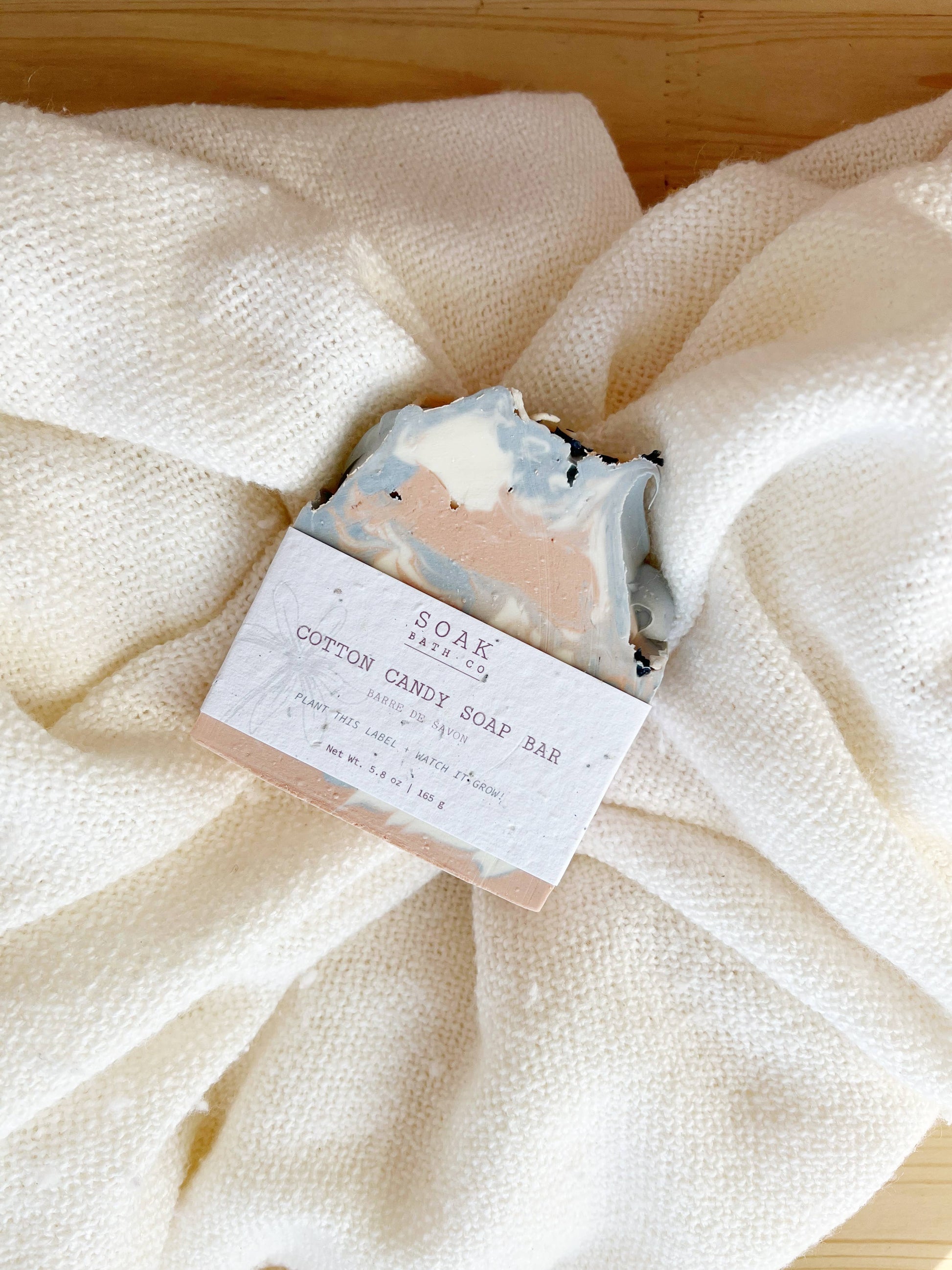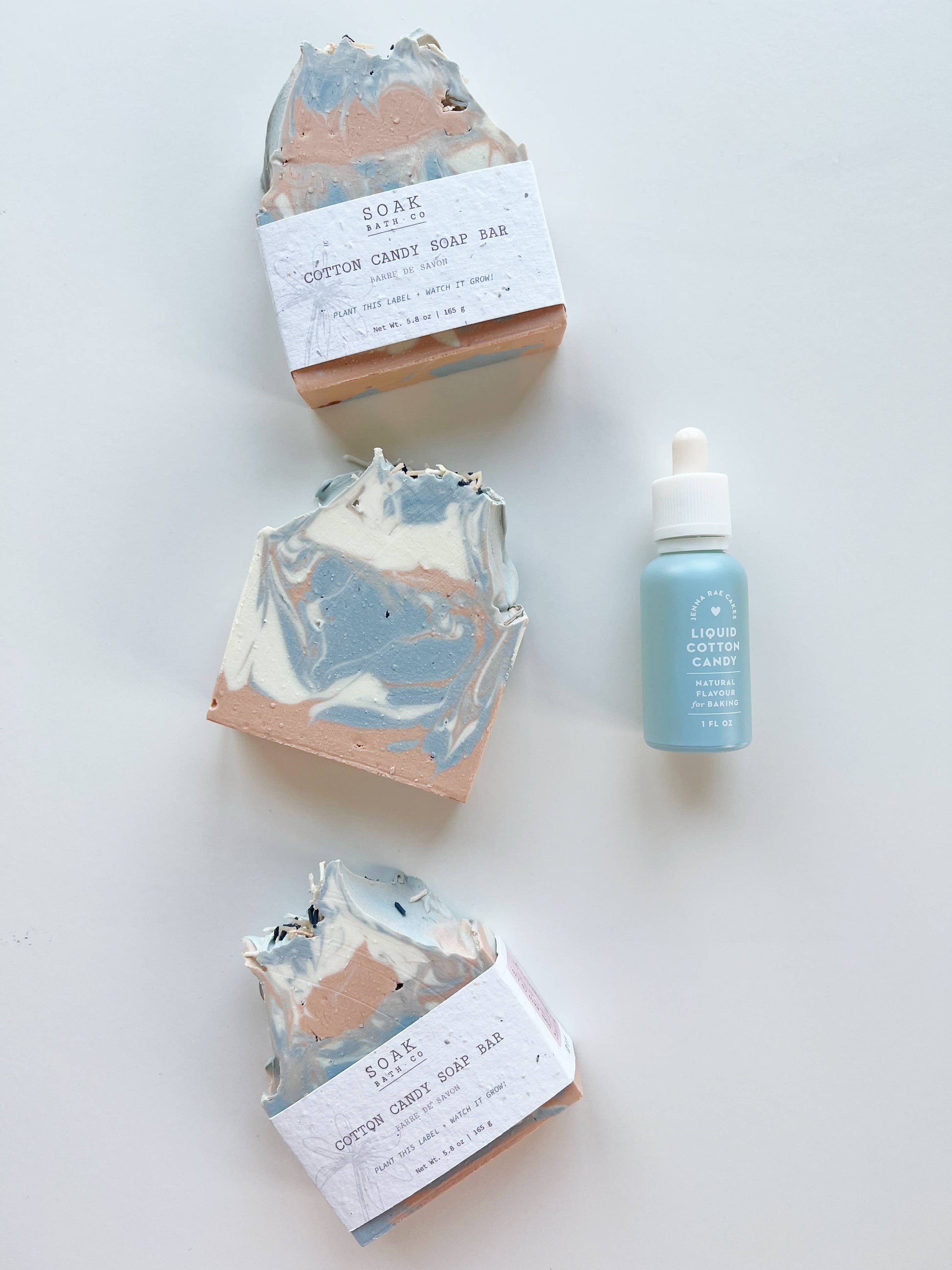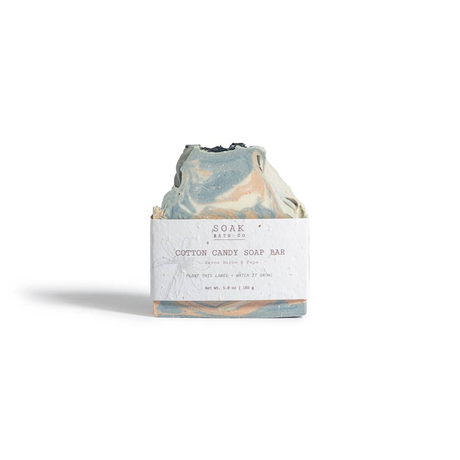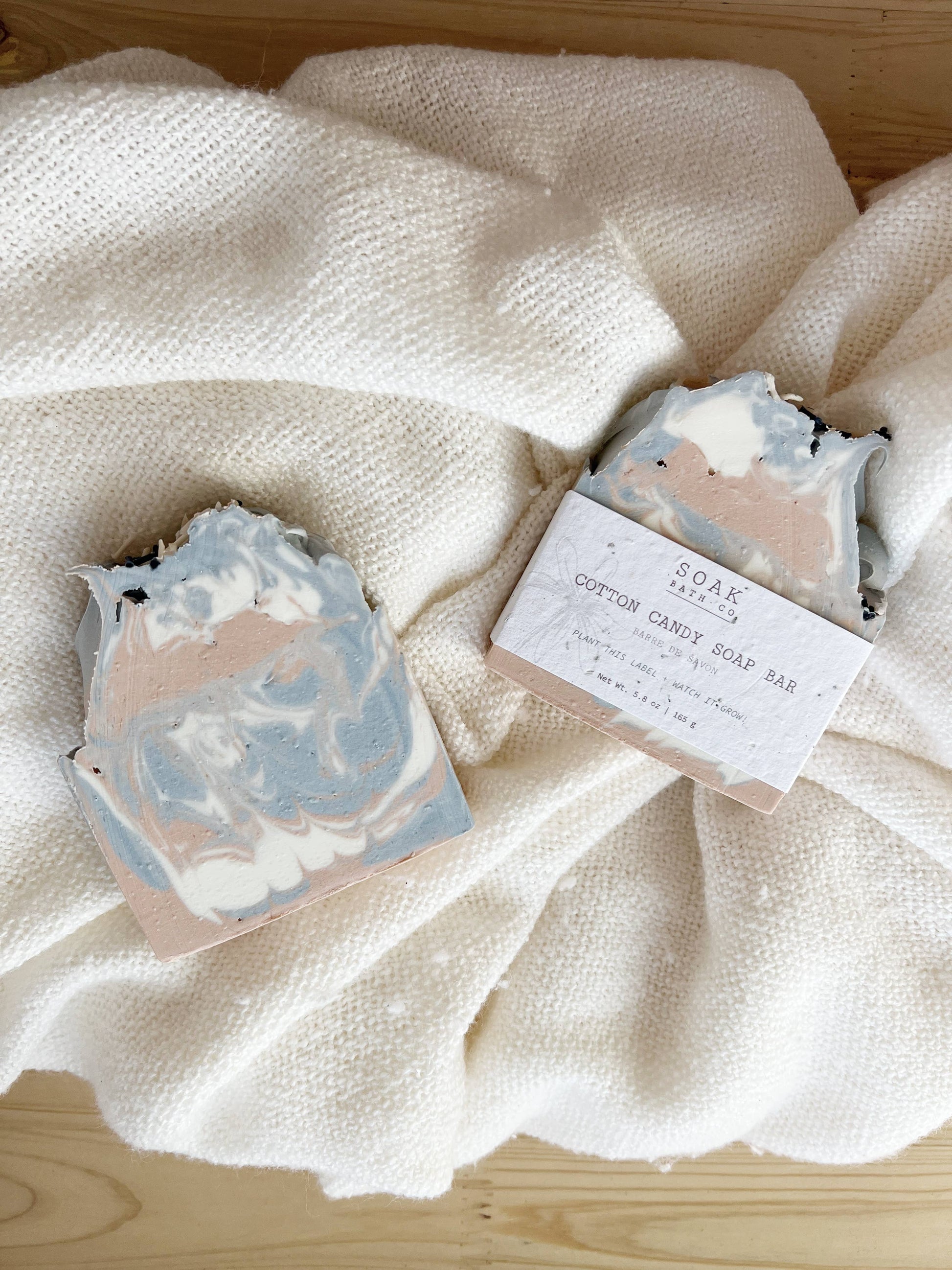 The Cotton Candy Soap Bar by SOAK Bath Co was inspired by your favourite, carnival treat and smells like it too! Handswirled with gorgeous light pink and blue cotton candy tones and topped off with soap sprinkles.