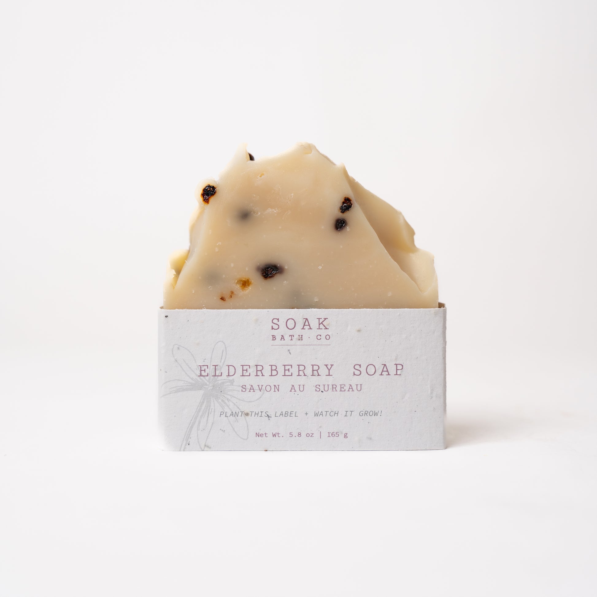This Elderberry soap bar is reminiscent of minty fresh gum. Some think wintergreen, others winter fresh, and even some think a touch of root beer. A very unique scent that provokes curiosity. Elderberries are sprinkled through the bar for a little added exfoliation. Recommended as a body bar and hand soap. This gorgeous bar is completely zero waste and sustainable. The label on each SOAK Bath Co bar is biodegradable, plantable seed paper so you can plant the label and it will grow into flowers