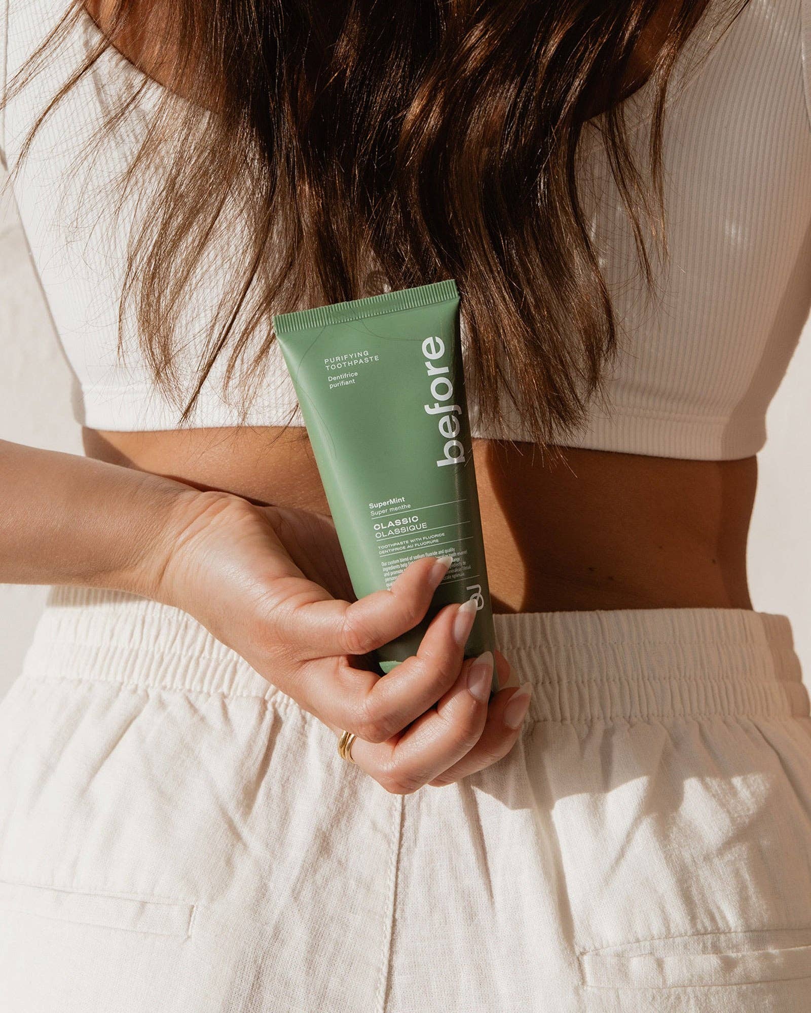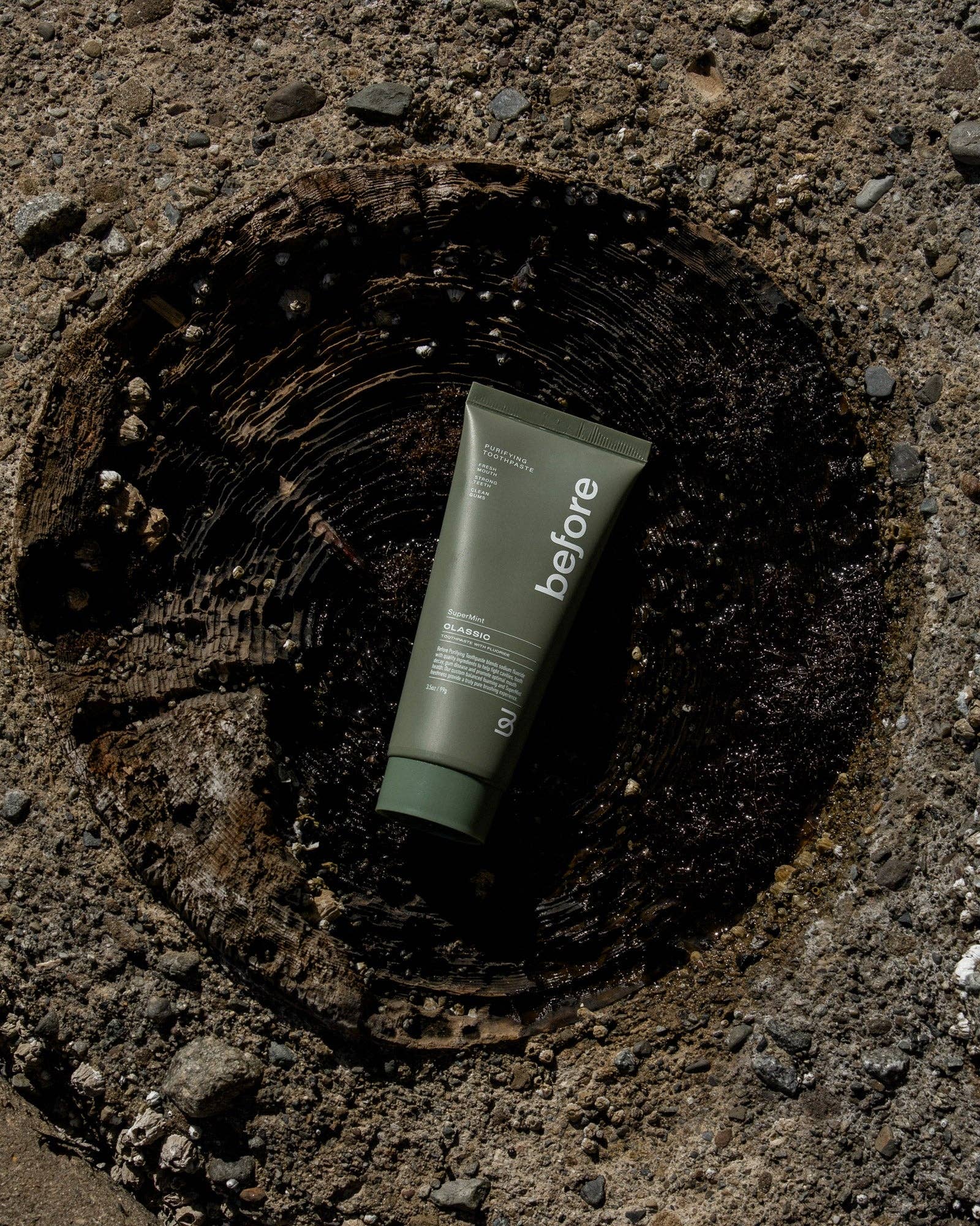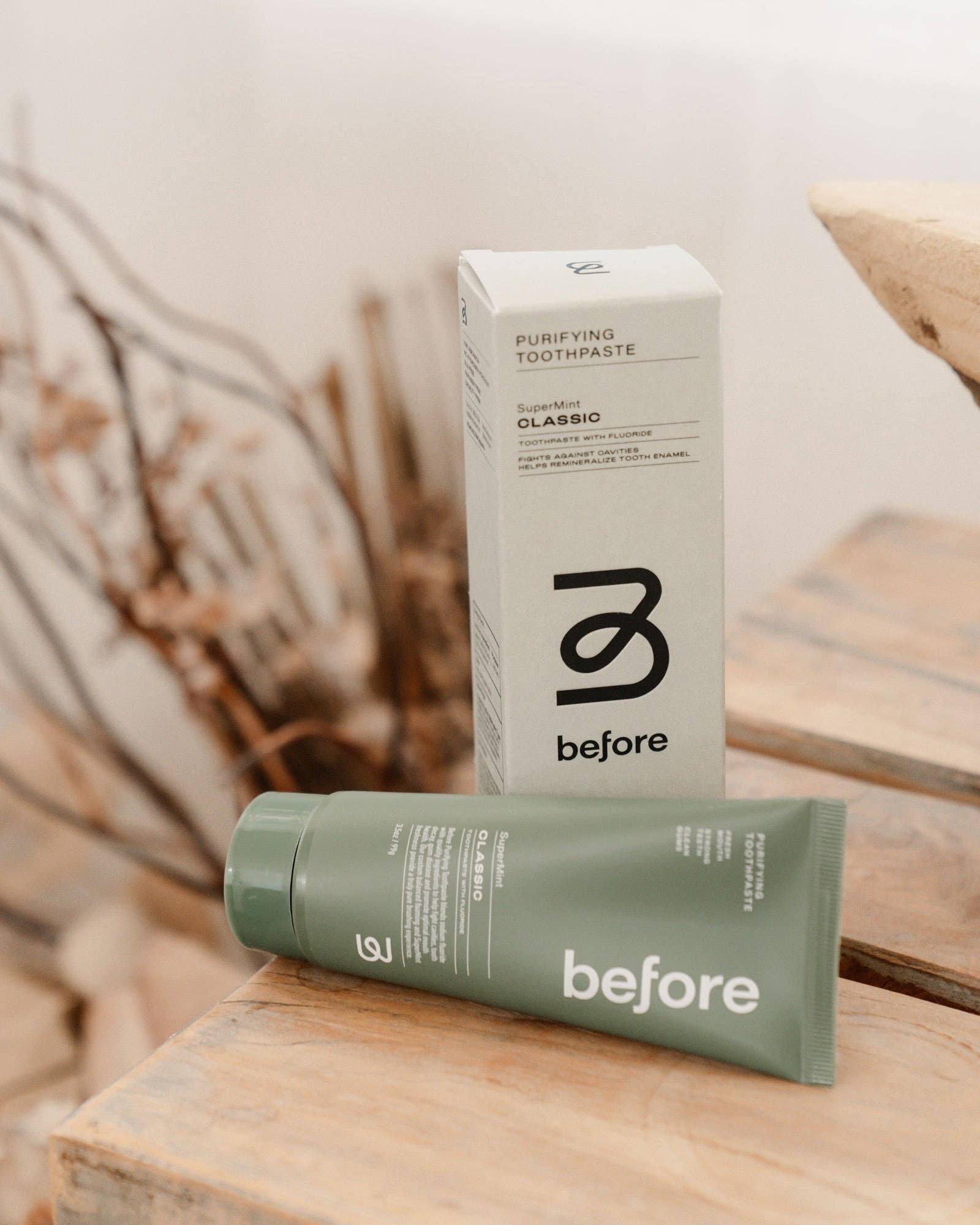 Your number one award-winning go-to cavity defence. Before’s natural Classic Toothpaste goes to battle against tooth degradation with our custom blend of high-quality ingredients and sodium fluoride. Upgrade your brushing routine with our perfectly balanced foaming, soothing SuperMint flavour and silky low-abrasion texture. Fight cavities, remineralize your tooth enamel, and level up your mouth health without harmful chemicals and synthetic ingredients.
