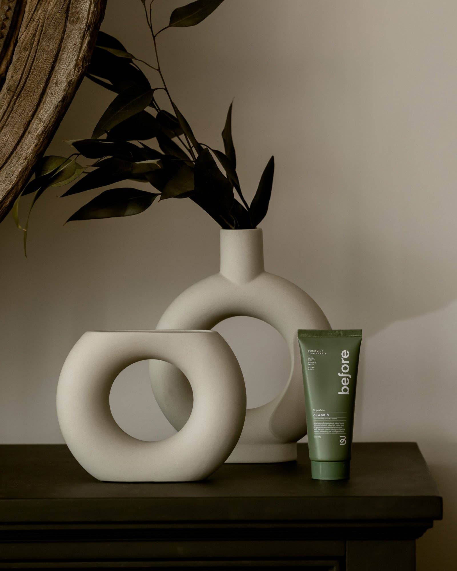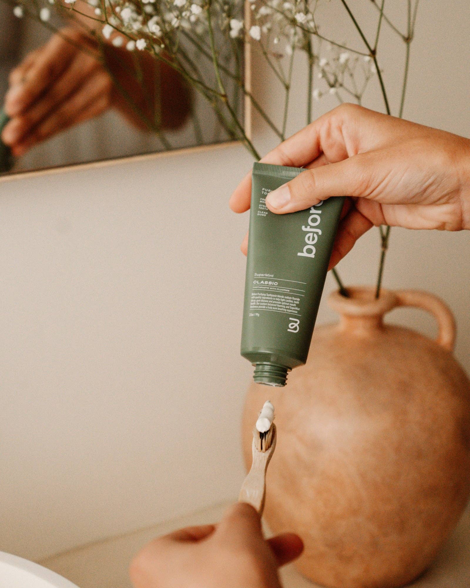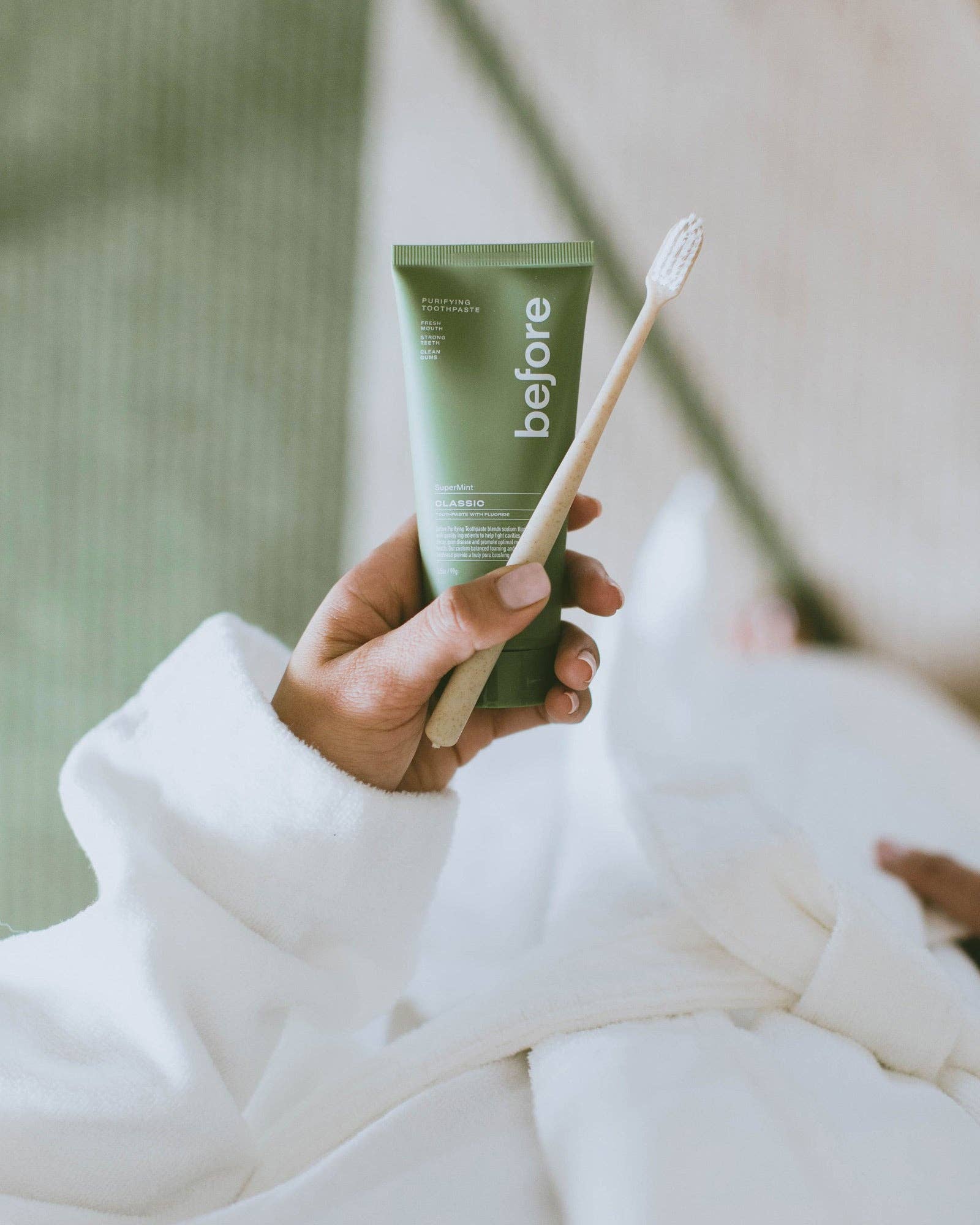 Your number one award-winning go-to cavity defence. Before’s natural Classic Toothpaste goes to battle against tooth degradation with our custom blend of high-quality ingredients and sodium fluoride. Upgrade your brushing routine with our perfectly balanced foaming, soothing SuperMint flavour and silky low-abrasion texture. Fight cavities, remineralize your tooth enamel, and level up your mouth health without harmful chemicals and synthetic ingredients.