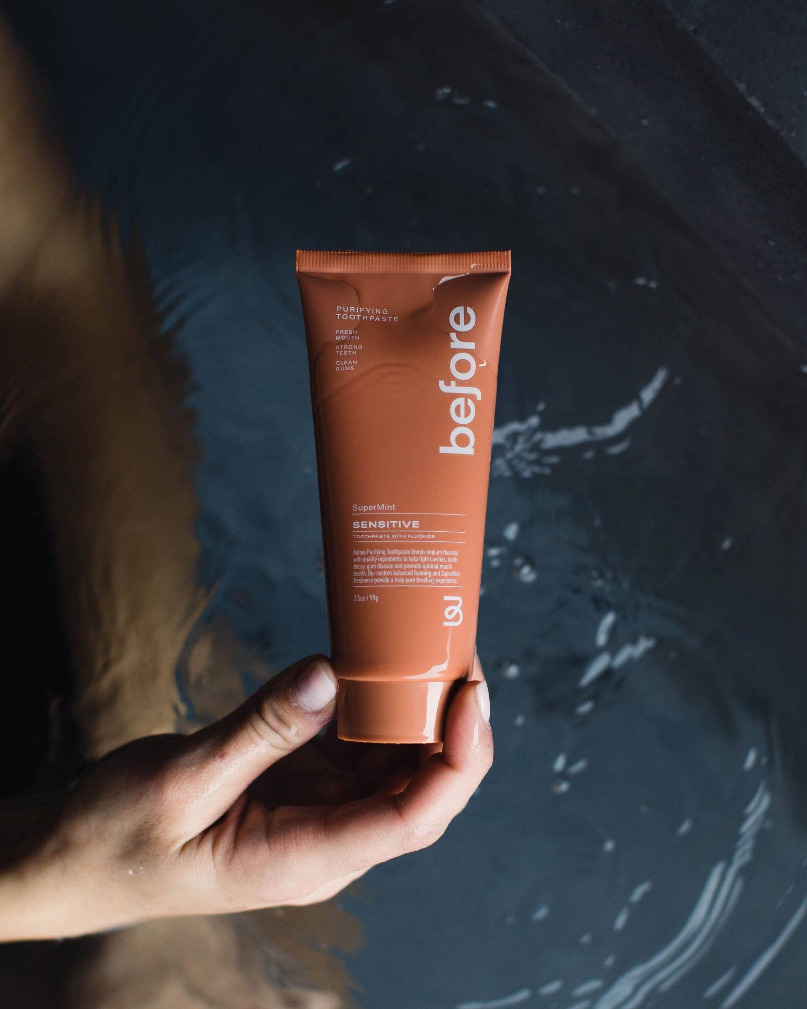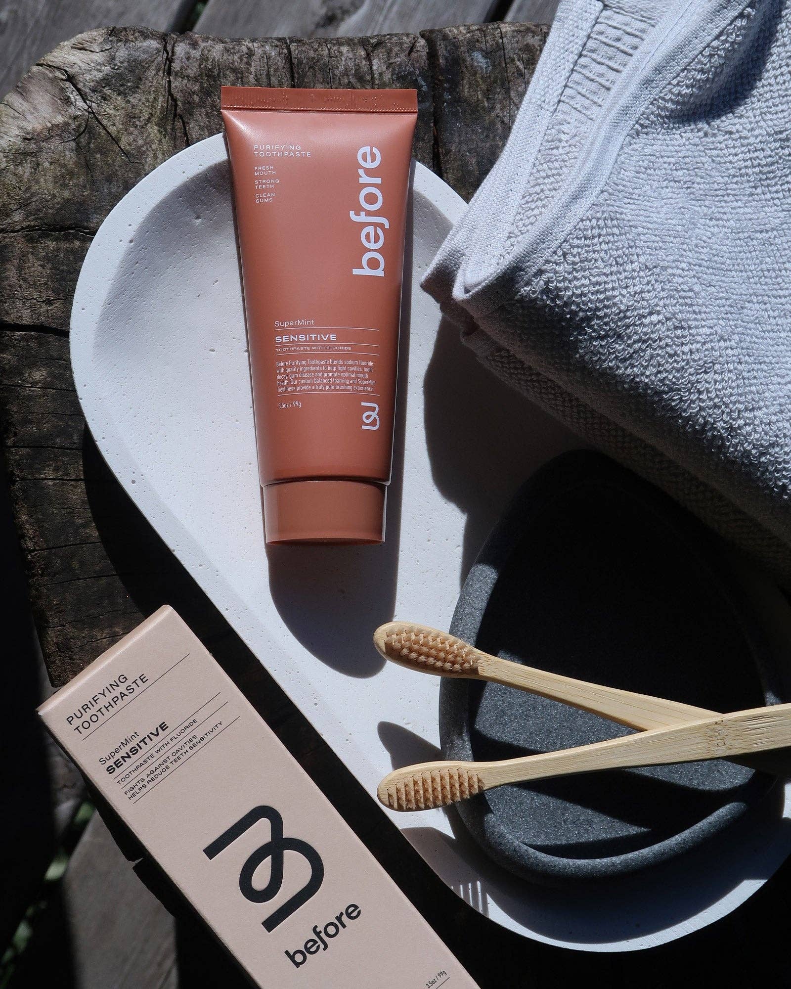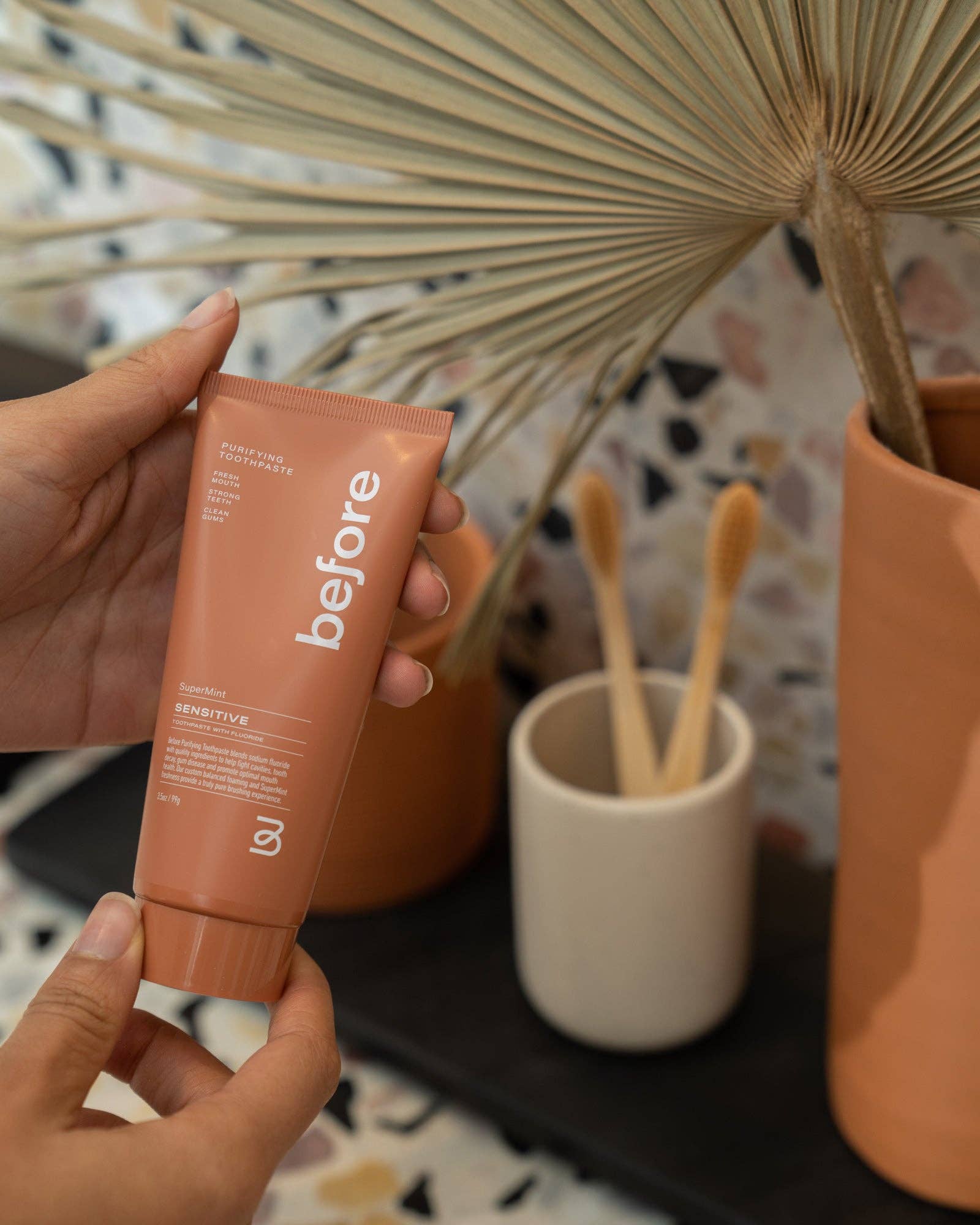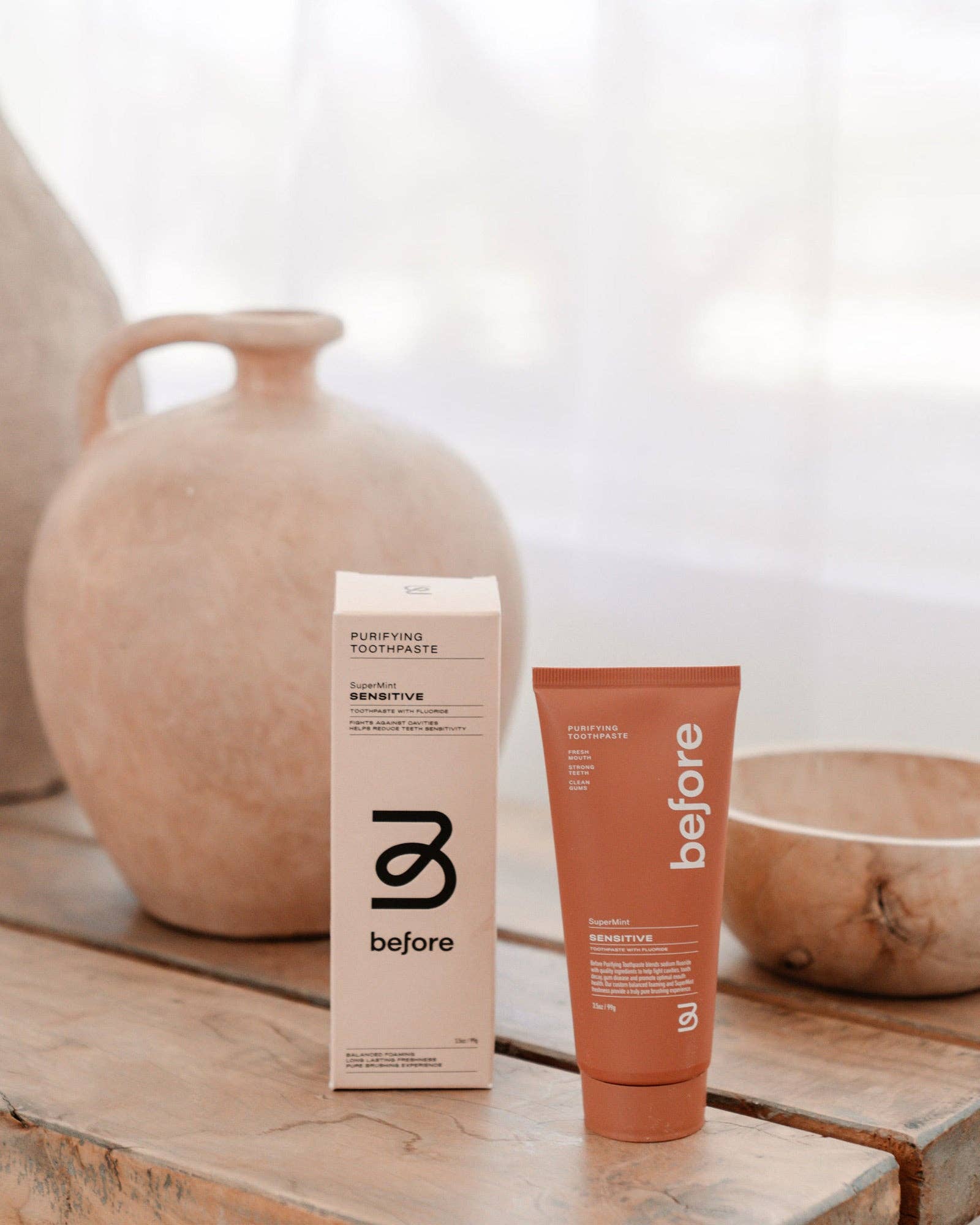 Breathe in and say goodbye to sensitive teeth. Before’s award-winning natural Sensitive Toothpaste soothes unpleasant teeth and gum sensitivity with our custom blend of high-quality ingredients and sodium fluoride. Upgrade your brushing routine with our perfectly balanced foaming, soothing SuperMint flavour and silky low-abrasion texture. Fight cavities, remineralize your tooth enamel, and level up your mouth health without harmful chemicals and synthetic ingredients.