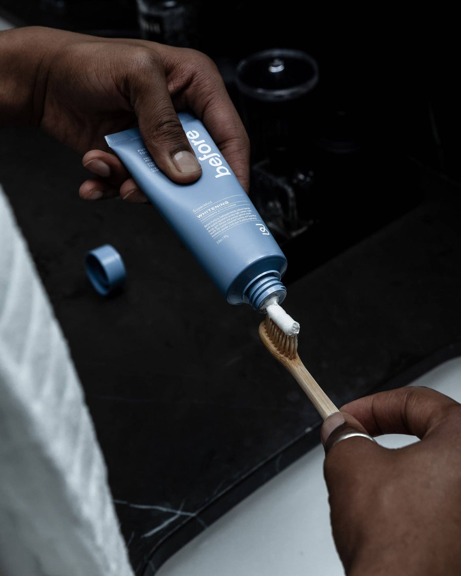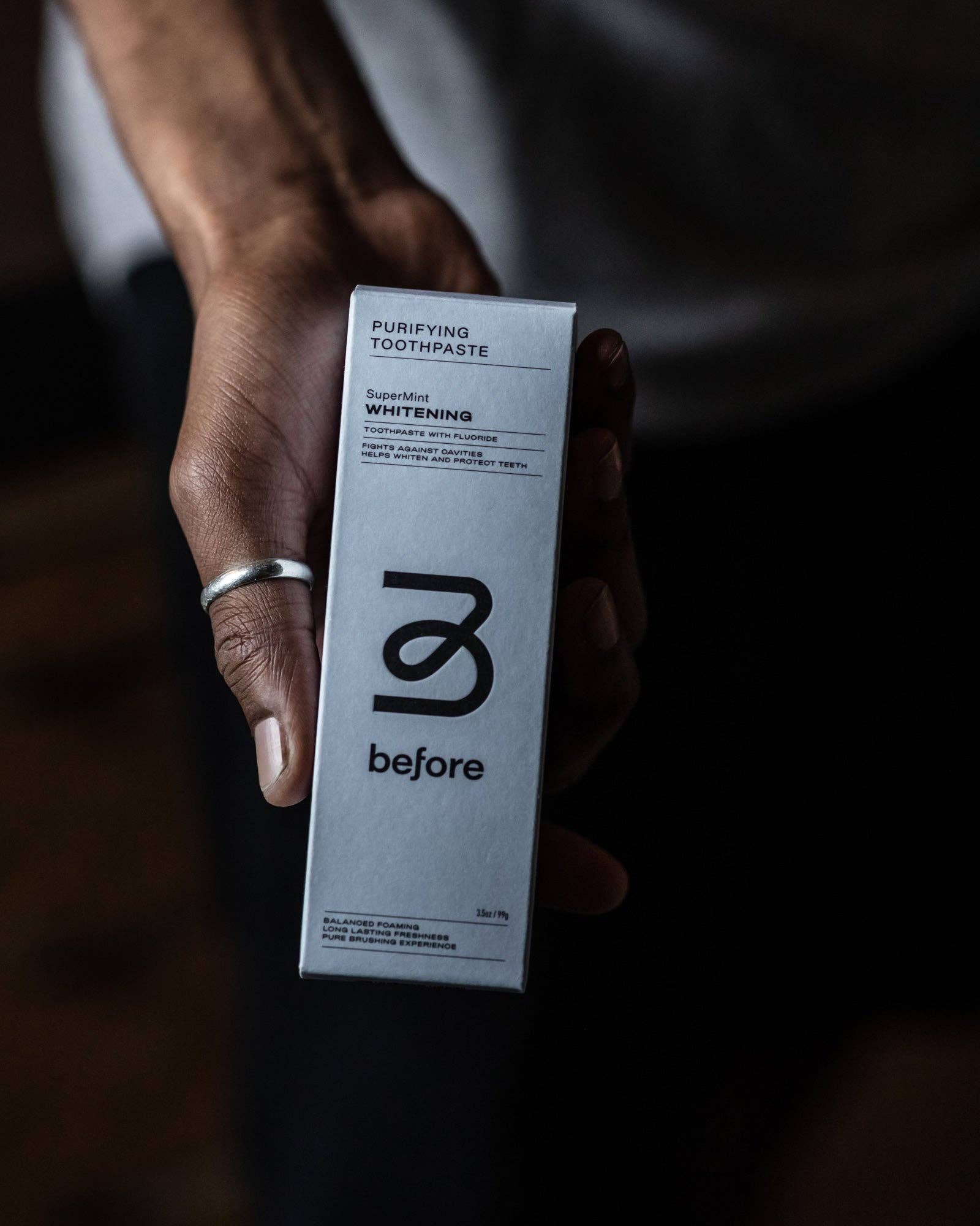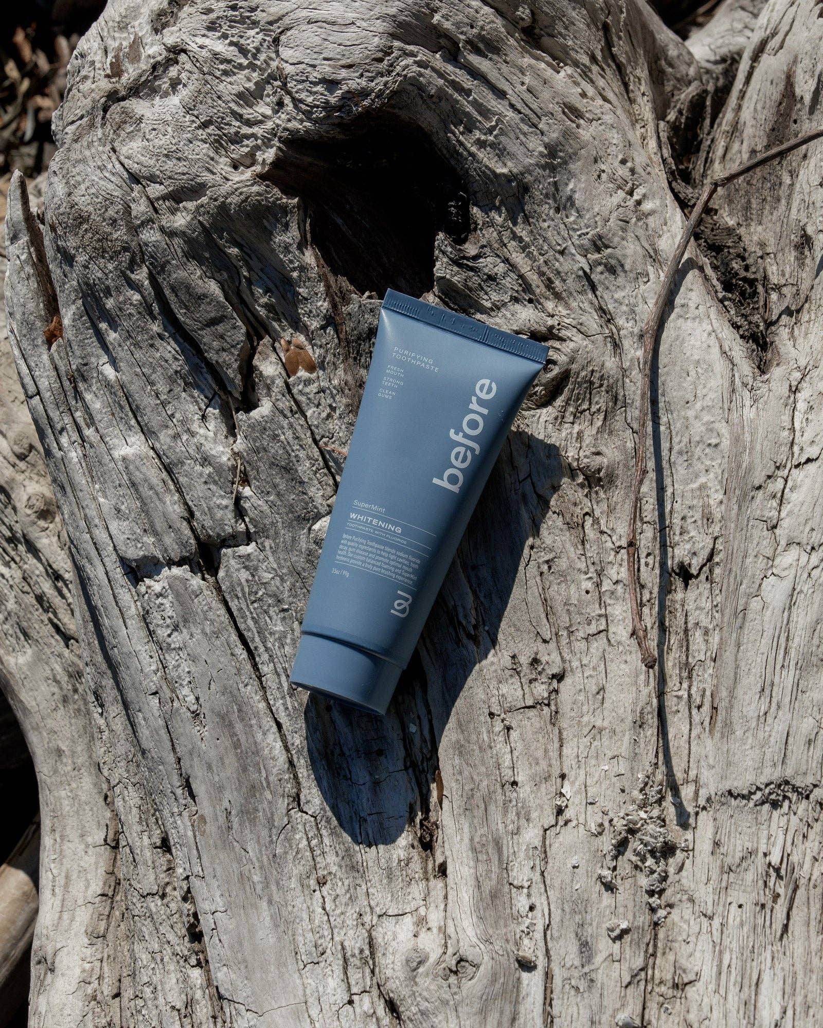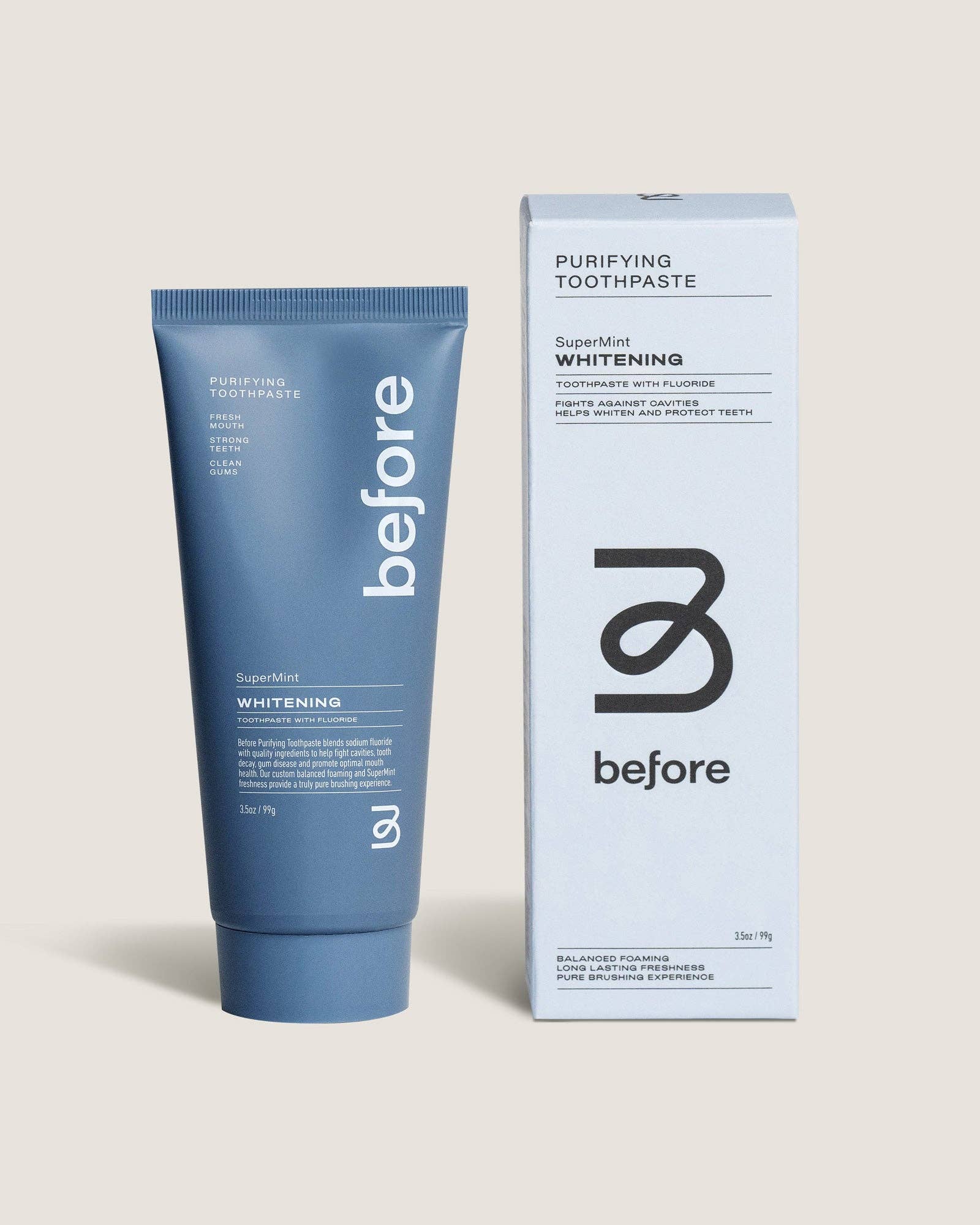 Incredible taste and incredibly clean, Before’s award-winning natural Whitening Toothpaste gradually and safely brightens your teeth with our custom blend of high-quality ingredients and sodium fluoride. Upgrade your brushing routine with our perfectly balanced foaming, soothing SuperMint flavour and silky low-abrasion texture. Fight cavities, remineralize your tooth enamel, and level up your mouth health without harmful chemicals and synthetic ingredients.