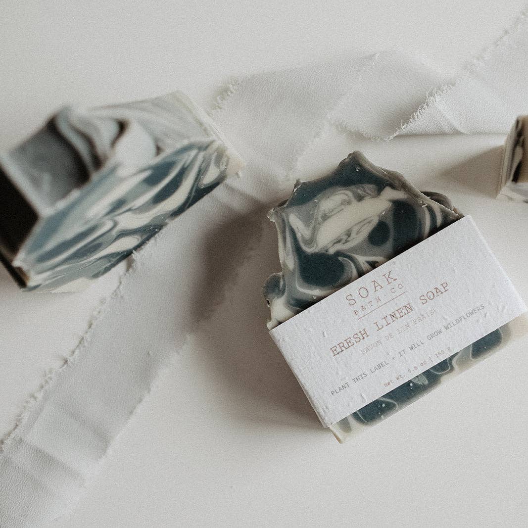 The Fresh Linen Soap Bar by SOAK Bath Co captures the nostalgic aroma of clean sheets on a breezy day—fresh, crisp, and wonderfully refreshing. This soap bar is your everyday go-to, bringing that just-out-of-the-dryer feeling to your daily routine.
