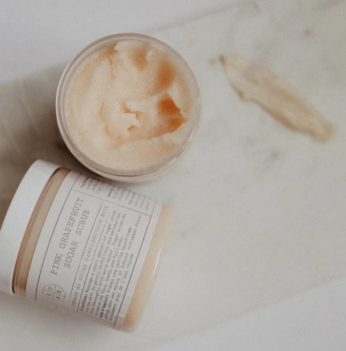 The Pink Grapefruit Sugar Scrub is made with a blend of coconut oil and sweet almond oil to create a moisturizing and exfoliating experience.