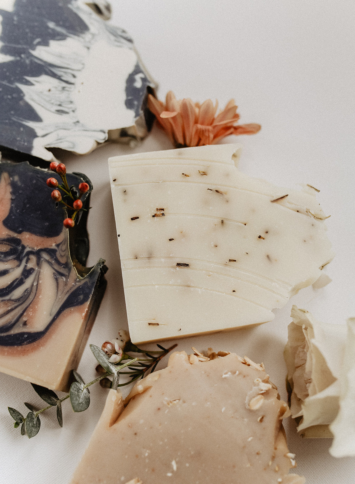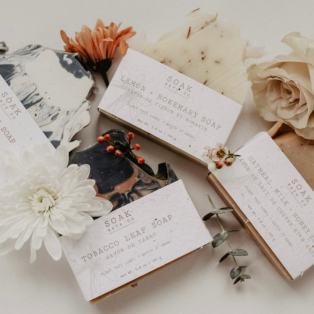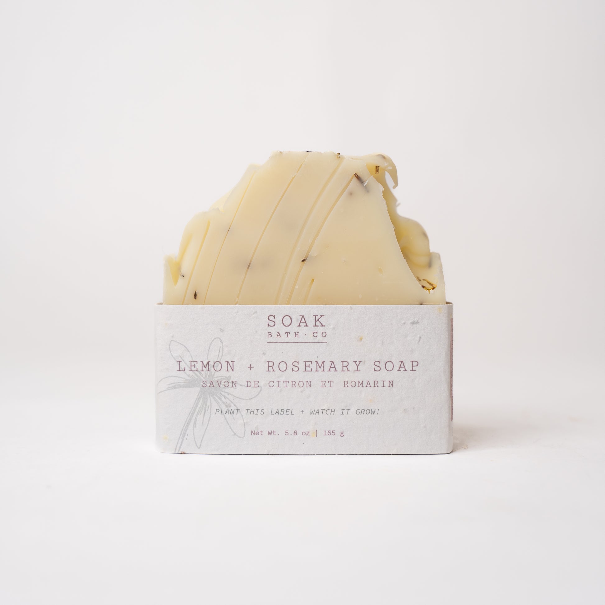 Lemon + Rosemary Soap Bar A savoury blend of Lemon and Rosemary essential oil come together for one of our best selling soap bars and my personal favourite (me, the maker, Candace). Rosemary sprigs are sprinkled throughout the bar for a light exfoliation of the skin. Recommended as a body + hand soap bar. This gorgeous bar is completely zero waste and sustainable. The label on each SOAK Bath Co bar is made of biodegradable, plantable seed paper so you can plant the label and it will grow into wildflowers!