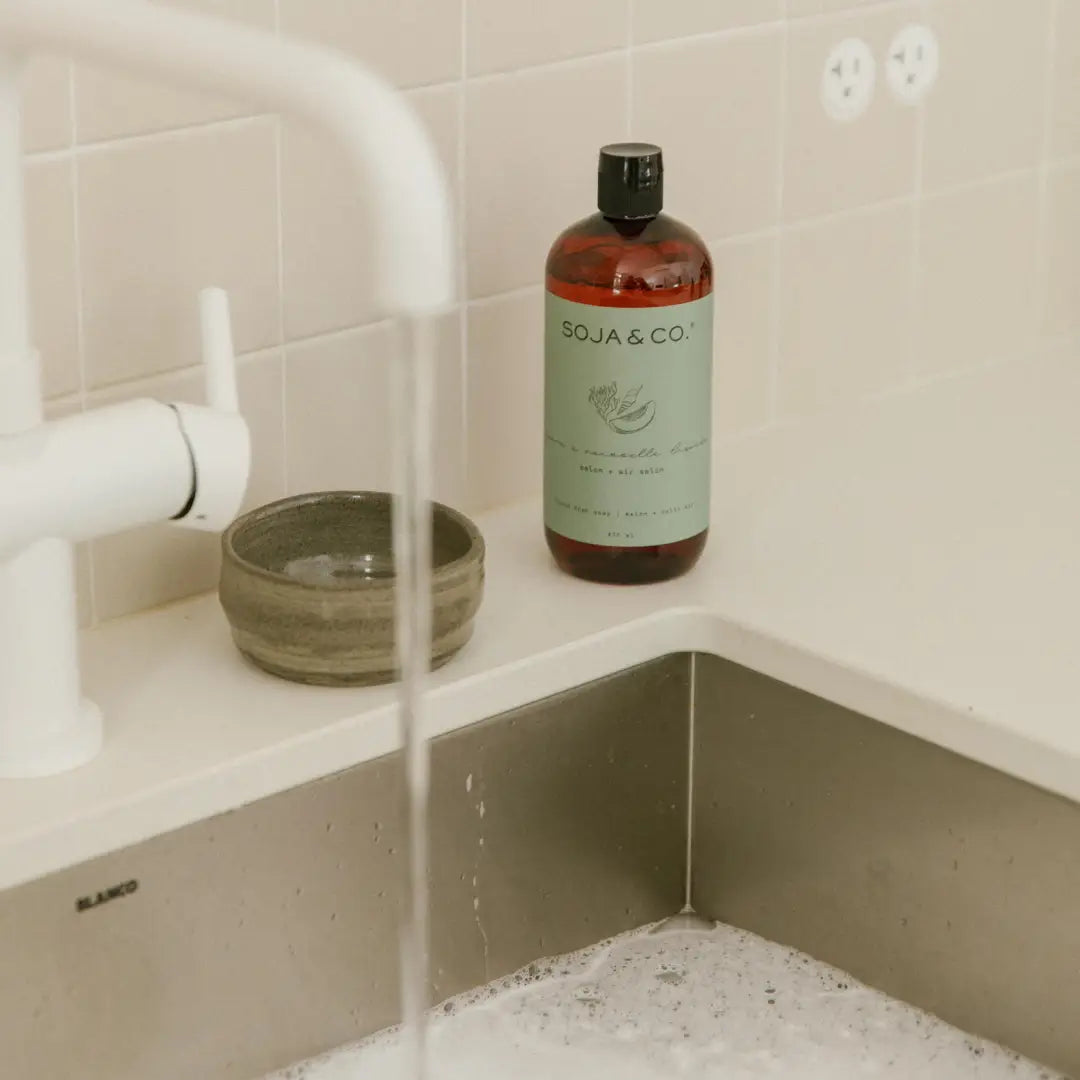 SOJA&CO.'s liquid dish soaps are made in Quebec with exclusive, phthalate-free vegan fragrances. Their biodegradable, non-toxic formula is ultra-concentrated, gentle on hands, and moisturizing. Just a small amount is enough, making them ideal for everyday use, camping, and even septic tanks. Fragrance description: A fruity and refreshing blend, combining the juiciness of melon with a hint of sea salt. a fragrance that’s both vibrant and revitalizing, transporting you straight to the seaside. Top notes: Airy Citrus, Fresh Salty Air Middle notes: Leafy Greens, Water Orchid, Sheer Coconut Base notes: Sea Grass, Driftwood Instructions: pour 2ml of dish soap per liter of hot water. do not use in a dishwasher. keep out of the reach of children, and avoid ingestion and contact with eyes.