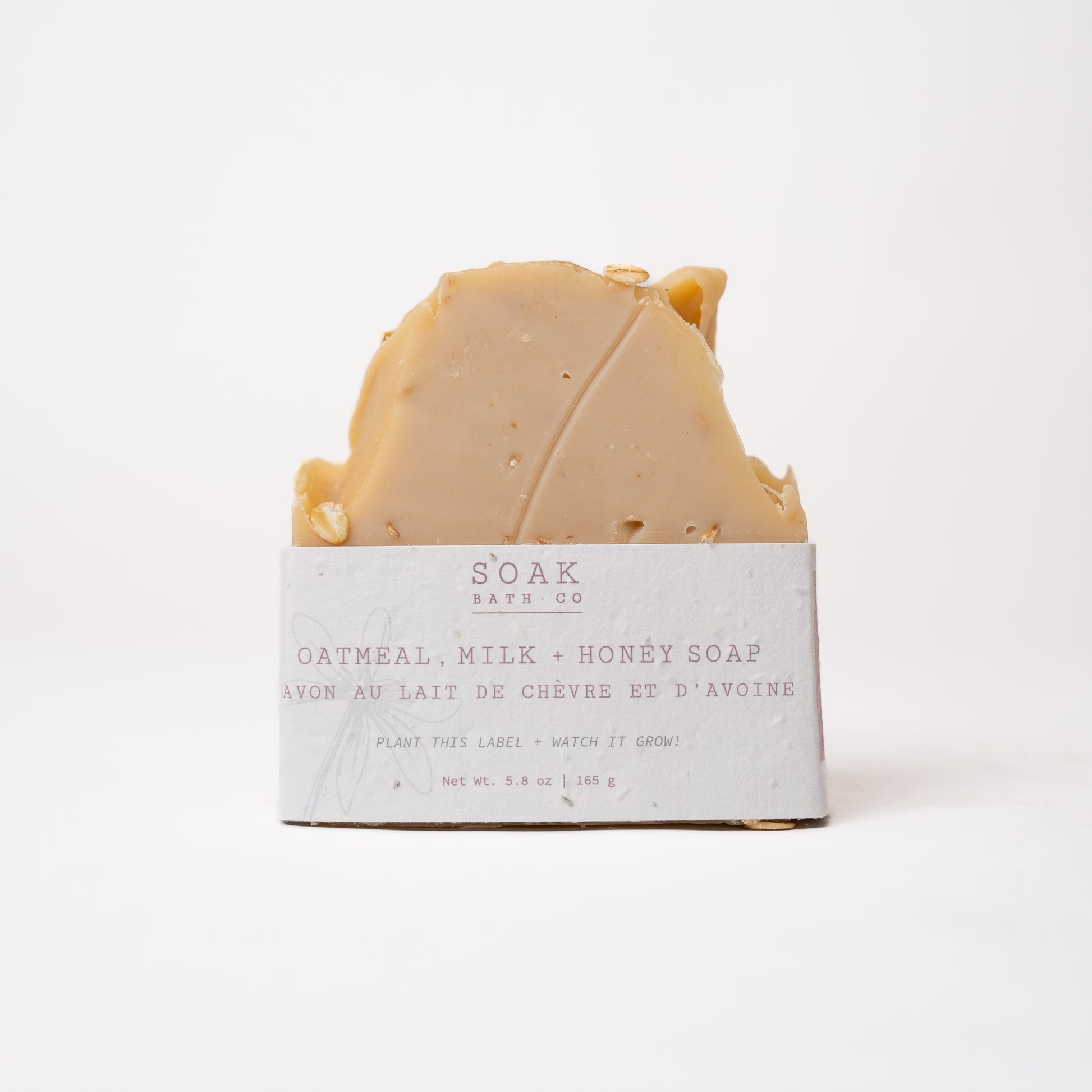 Oatmeal, Milk + Honey Soap Bar The Oatmeal, Milk and Honey Soap bar is neutral and cozy. Made with goat's milk that offers added nourishment to the skin it's a go-to for everyday use. Whole oats are folded into the bar for gentle exfoliation on the skin. Recommended as a body bar, hand and facial bar. This gorgeous bar is completely zero waste and sustainable. The label on each SOAK Bath Co bar is made of biodegradable, plantable seed paper so you can plant the label and it will grow into wildflowers!