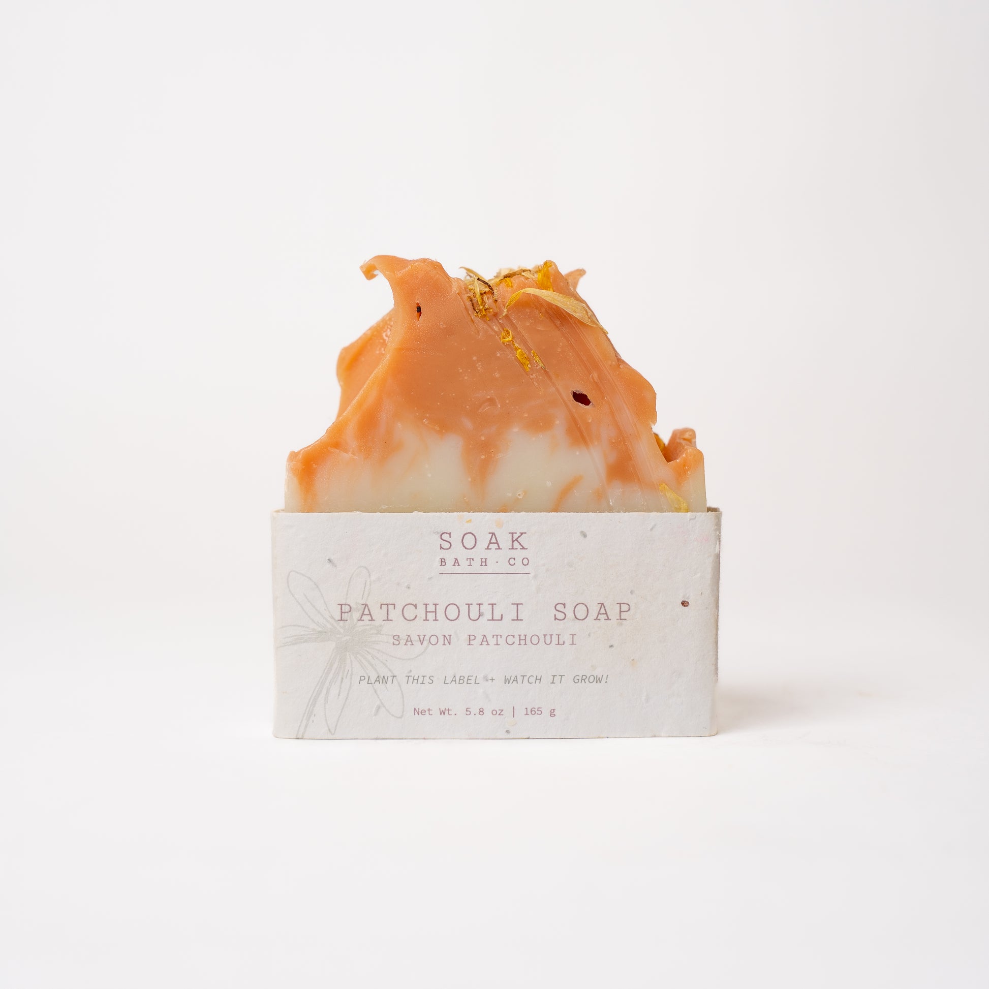 This classic Patchouli soap bar will take you right back to the 60s. Natural and earthy would best describe this scent. This bar is made with locally produced, Manitoba hemp seed oil for an added local flair. Recommended as a body bar and hand soap. This gorgeous bar is completely zero waste and sustainable. The label on each SOAK Bath Co bar is made of biodegradable, plantable seed paper so you can plant the label and it will grow into wildflowers!