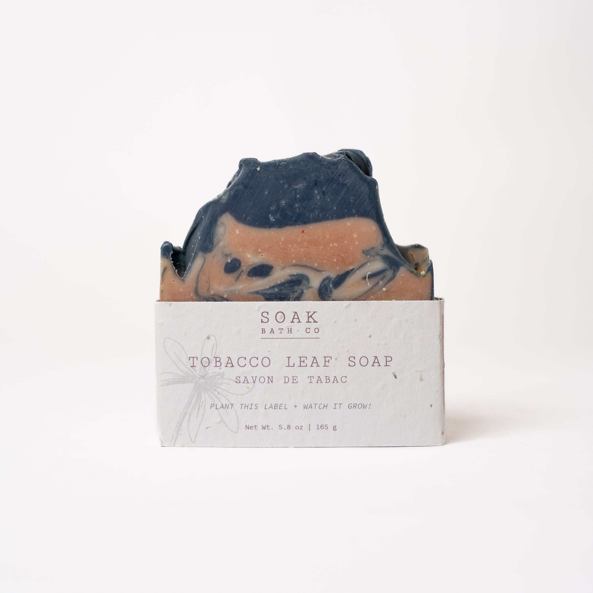 Tobacco Leaf Soap Bar This bar is the best selling soap bar in the product line. It's got amazingly masculine notes with a touch of added sweetness. If you're looking for a little treat for yourself or need to find a soap bar for any man in your life, I guarantee he will not be disappointed. Labelled with plantable seed paper so you can plant the label and it will grow into wildflowers!